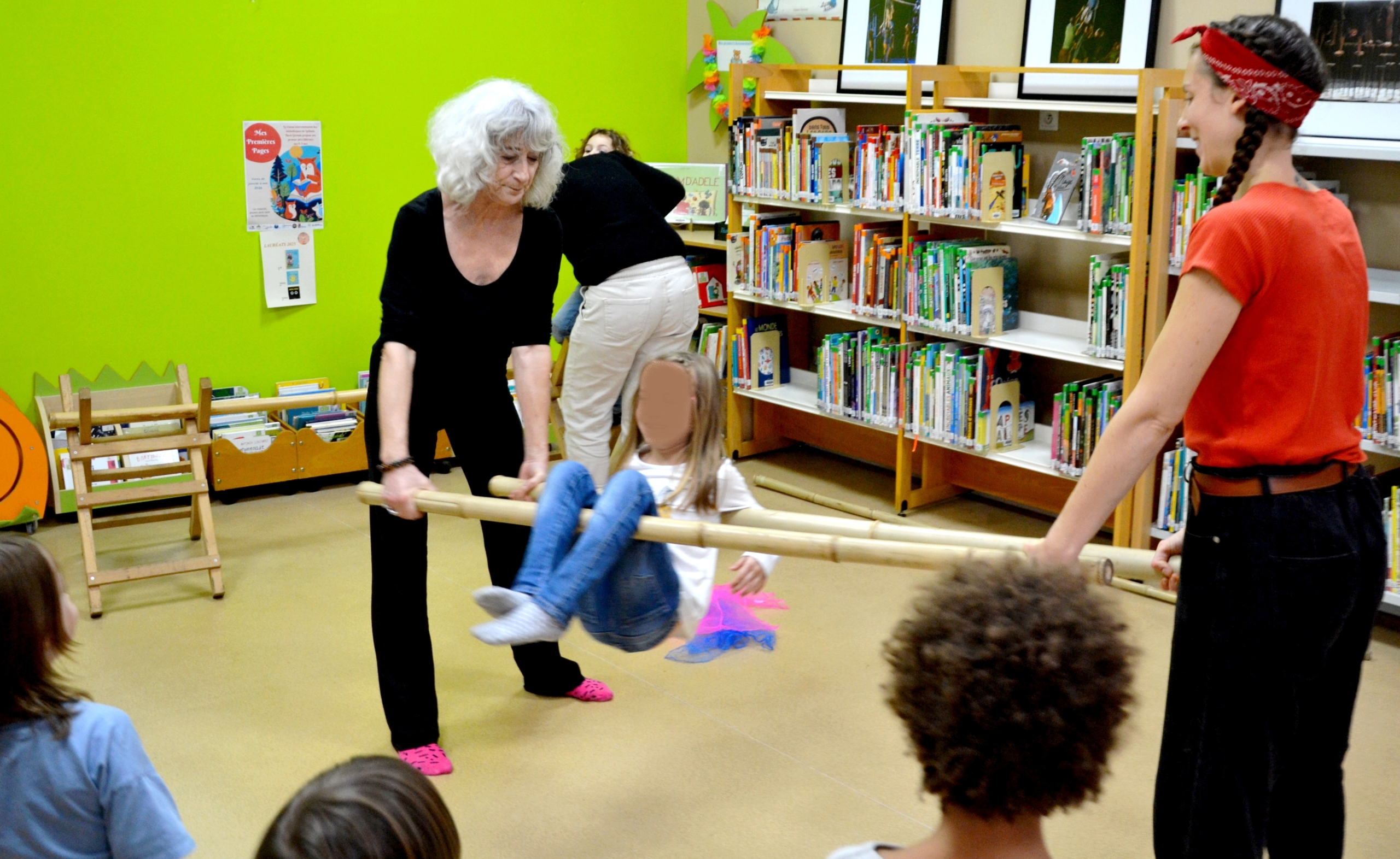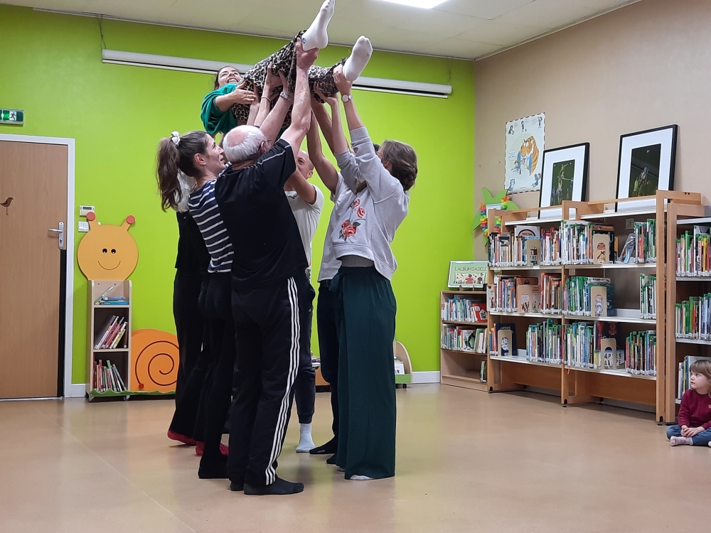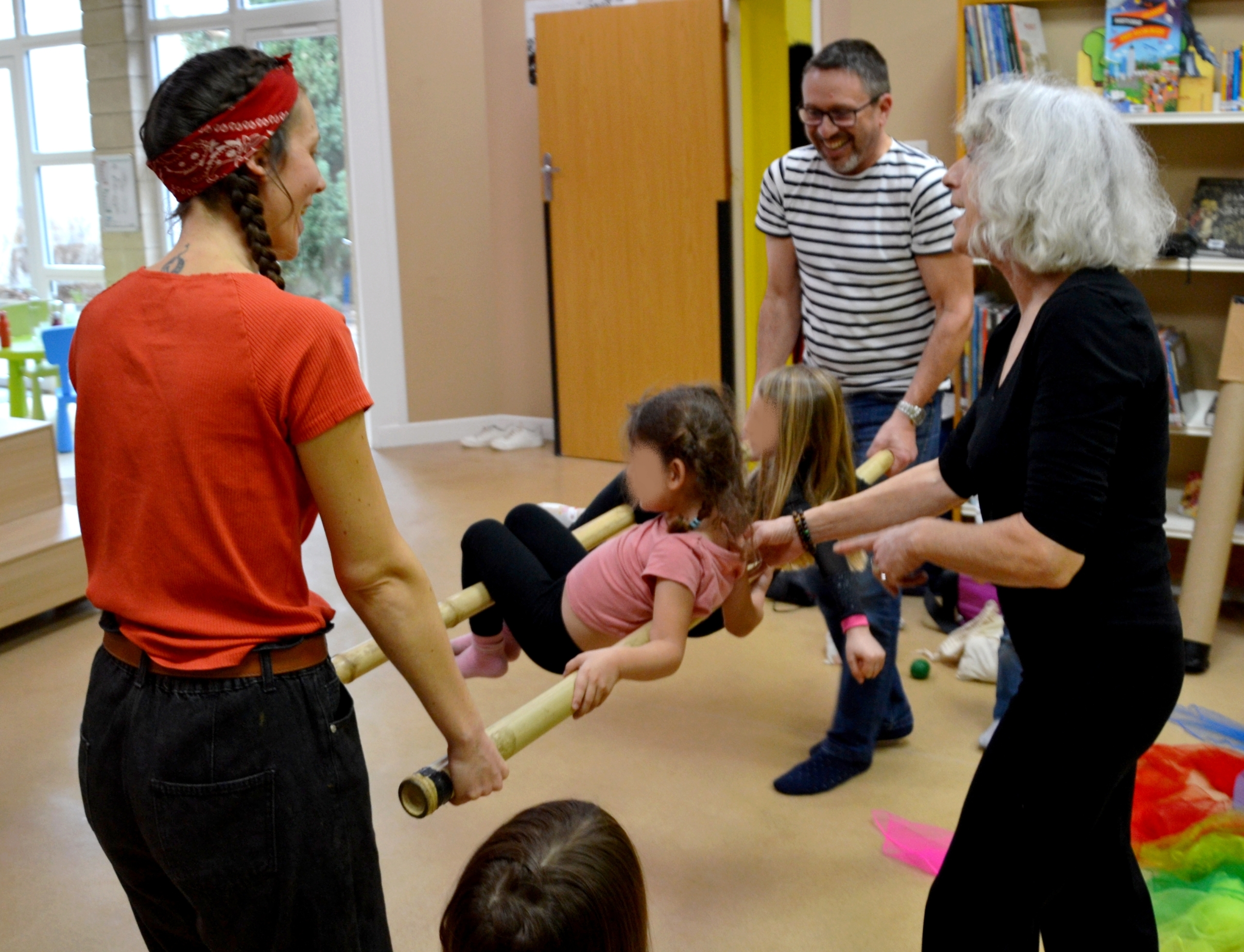 les enfants de 3 à 6 ans accompagnés d’un adulte chacun se sont initiés aux portés acrobatiques, au fildeférisme et au jonglage.