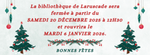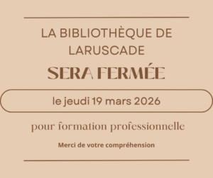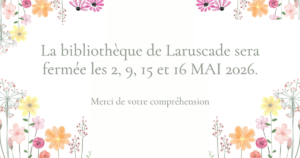 Page Facebook : La page Facebook de la bibliothèque permet de vous tenir informé des achats et autres nouveautés, des coups de cœur littéraires du moment mais également des animations et manifestations proposées par la bibliothèque de Laruscade et par les autres structures culturelles du canton. Bref, une vraie mine d’information ! Pensez à vous abonner.